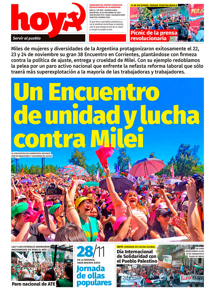 Es necesario unir la lucha de los trabajadores ocupados, los jubilados, los desocupados y precarizados junto a las de todo el pueblo; de los campesinos y de las economías regionales condenadas a muerte por esta política, la de las naciones y los pueblos originarios en defensa de sus tierras y sus derechos, así como las peleas por educación y salud para todas y todos y por una cultura verdaderamente nacional. Todo eso va atado a la defensa de nuestra soberanía, cada vez más amenazada por esta política de sumisión. Como hemos aprendido en estos dos años, la lucha y la unidad es el camino. Lo demostraron el triunfo de los trabajadores del Garrahan y ahora el grito opositor de miles de mujeres y disidencias en el Encuentro de Corrientes.