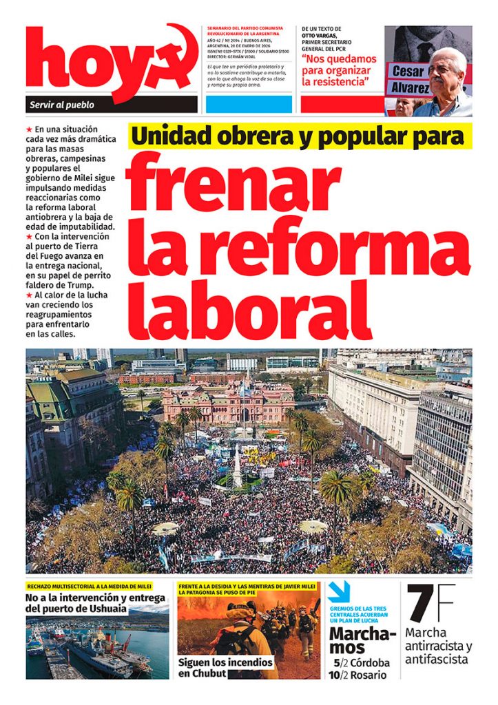 1. Crece la bronca popular El malestar se extiende porque esta política que Milei y su gabinete pretenden mostrar como un éxito a partir de superficiales cifras financieras, es un desastre en la producción y la vida cotidiana del pueblo. Las verdaderas cifras muestran miles de despidos, crecimiento del hambre, expulsión de la producción de miles de campesinos pobres y medios con crisis de las economías regionales, en la educación, la salud y la cultura, con destrucción de la industria, golpes a la burguesía nacional y entrega creciente de nuestra soberanía. Por eso las luchas que recorren la Argentina buscan la unidad y coordinación que les permitan torcerle el brazo a esta política. En ese contexto tiene importancia el plan de movilización contra la ley de reforma laboral y el ajuste de Milei, acordado por más de 80 organizaciones sindicales y desocupados, reunidas en el frente de Unidad Sindical. Comienza mañana 5 de febrero con una marcha en la ciudad de Córdoba, que se preparó con la participación local de gremios como la UOM, Alimentación, Trabajadores del jockey, Gráficos, Camioneros, Ladrilleros, La Bancaria, Suoem, Químicos, Adiuc, ATE. Espectáculos públicos, CCC, Cispren, controladores aéreos, Aceiteros, Ceramistas, Aoita. La movilización continuará con otra marcha en Rosario el 10 F, en un camino de confluencia hacia una marcha y paro general el día que se trate en el Congreso. La Fraternidad (maquinistas ferroviarios), decretó un paro general de 24 horas para el mismo 5, en rechazo a la propuesta de recomposición salarial del…