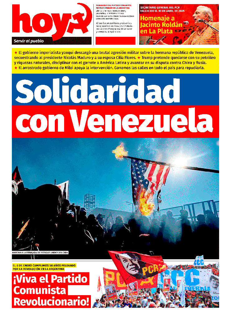 1. Bárbara agresión militar yanqui a Venezuela La brutal intervención militar del gobierno yanqui de Trump en Venezuela y el secuestro del presidente venezolano Nicolás Maduro y su esposa en la madrugada del 3 de enero son un hecho gravísimo de injerencia imperialista y de violación criminal de la soberanía venezolana y el derecho internacional. Como planteó el comunicado de nuestro PCR (ver página 3), en el que expresamos la plena solidaridad con Venezuela frente a esta escalada belicista: “Ningún país extranjero tiene derecho a intervenir de esta manera en los asuntos internos de otro Estado. Sólo el pueblo venezolano tiene derecho a decidir su destino. La intervención militar estadounidense muestra la falsedad de sus argumentos de ‘lucha contra el narcotráfico’. El imperialismo yanqui, como parte de su disputa con las otras potencias imperialistas por el control de América Latina y el mundo, lo que quiere son los recursos estratégicos de Venezuela”. En declaraciones posteriores al ataque, Trump reafirmó que lo que quiere es el petróleo de Venezuela, que tiene las mayores reservas del mundo, 303.000 millones de barriles. Con la brutalidad que lo caracteriza dijo: “Nos quitaron nuestros derechos petroleros, a pesar de que hay mucho petróleo allí, como saben, expulsaron a nuestras empresas, y lo queremos de vuelta”. El imperialismo yanqui, al tiempo que secuestraba a Maduro y a Flores asesinando a decenas de militares (Cuba reconoce a 32 muertos que formaban parte de la custodia presidencial), bombardeó bases militares en Caracas y otros lugares del país. No…