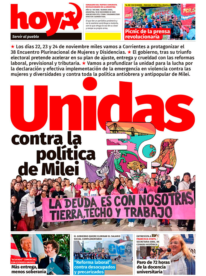 Como dice la nota de María Rosario, nuestra responsable del PCR del trabajo entre las mujeres, que publicamos en páginas centrales: “Hoy más que nunca, necesitamos encontrarnos ante el aumento desmedido del odio y la violencia impulsados desde despachos oficiales. Nos preparamos para ser protagonistas de ese abrazo colectivo y llevar adelante una vez más este evento único en el mundo y faro para los movimientos hermanos de América Latina y el mundo… Reafirmamos que vamos a profundizar la lucha contra esta política de ajuste, entrega y represión”.