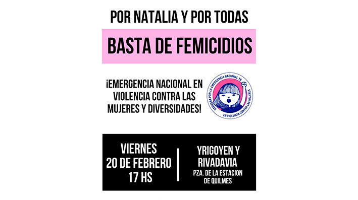 Como cada año, este 20 de febrero nos damos cita en la Plaza de la Estación de Quilmes para recordar a Natalia López y reclamar contra los femicidios y por la emergencia en violencia contra las mujeres.