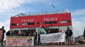 Estibadores griegos bloquean la salida de un buque como parte de una huelga en más de 20 puertos europeos contra el genocidio