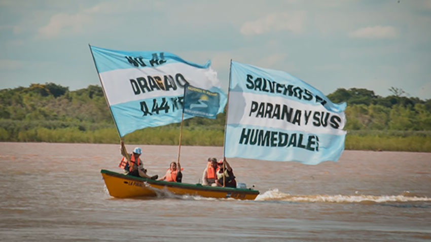Portando llamativas banderas argentinas con consignas como “el Paraná en manos argentinas”, “no a los 44 pies” y “Argentina sangra por el Paraná”, se manifiestan “en firme oposición a una nueva privatización, extranjerización y a la destrucción del río ‘al que mal llaman hidrovía’, como a las pretensiones de profundizar su dragado a 44 pies, lo que constituiría ‘un verdadero ecocidio’, sin ningún estudio de impacto ambiental.