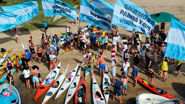 Javier Nuñez, uno de los organizadores de la travesía, advirtió que “con el dragado actual, en 36 pies, se ha agudizado la crisis hídrica que viene afectando a nuestra zona (taponamiento de bocas, reducción de las lagunas y riachos que funcionan como cortafuegos naturales y áreas de reproducción de peces), poniendo en serio riesgo el acceso del agua como recurso vital en casos como nuestra vecina ciudad de Victoria (Entre Ríos) y todo el ecosistema vinculado a los humedales, y concibiendo al Paraná como una ‘autopista fluvial’ para el ingreso de buques de ultramar en el medio de un continente (lo que no existe en ningún lugar del mundo) en absoluto beneficio de las grandes multinacionales que hoy tienen el control del comercio exterior”.